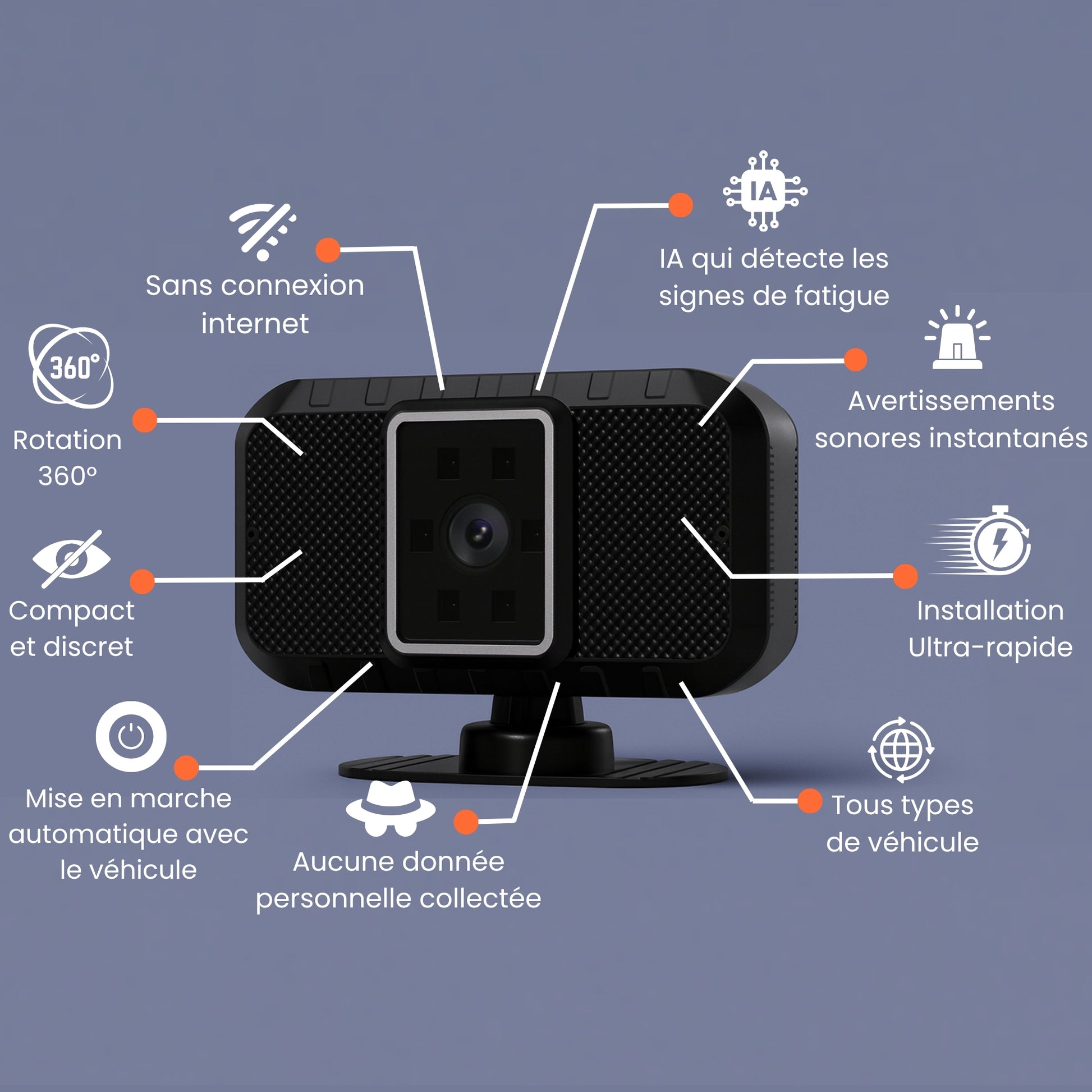 La somnolence au volant est imprévisible : vos yeux se ferment, votre vigilance chute et l’accident peut arriver en quelques secondes. QOPILOTE analyse vos yeux en temps réel et déclenche aussitôt une alerte sonore. Compact et discret, il s’installe facilement sur le tableau de bord, fonctionne de jour comme de nuit, sans abonnement ni connexion internet. Fournie avec une prise allume-cigare double USB et un câble USB-C, la caméra vous accompagne partout, sans jamais enregistrer aucune donnée personnelle.